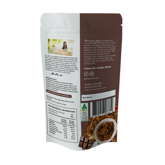 I’m so hooked on Puff Delights Chocolate Granola! It’s the perfect blend of crunchy and chocolatey, and it satisfies my cravings without any guilt. I love that it’s gluten-free, high in fiber, and made with organic ingredients. It’s a great snack that’s not only delicious but also good for my gut. Plus, knowing it’s handmade in Australia makes it even better! Definitely a must-try for anyone looking for a healthier snack option!